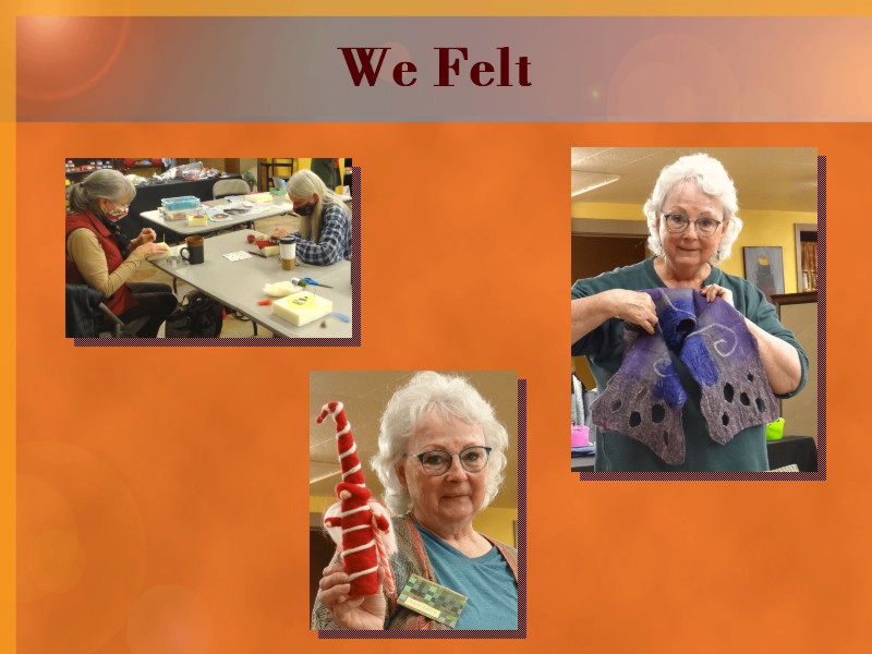 Each meeting features social time, an educational program, show & share and a raffle, as well as a general business meeting. The Guild is active in community outreach and several times each year members demonstrate their arts at community events such as fairs, libraries, and farmers markets.