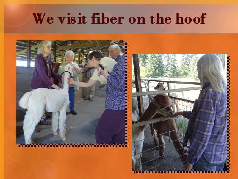Sacajawea Fiber Arts Guild welcomes all fiber enthusiasts. Currently members are work on such fine arts crafts as weaving, spinning, felting, dyeing, crochet, knitting, needlework such as cross stitch and embroidery, braiding, basketry, and more. Some of our members even raise fiber animals and process their fiber into roving and yarn!